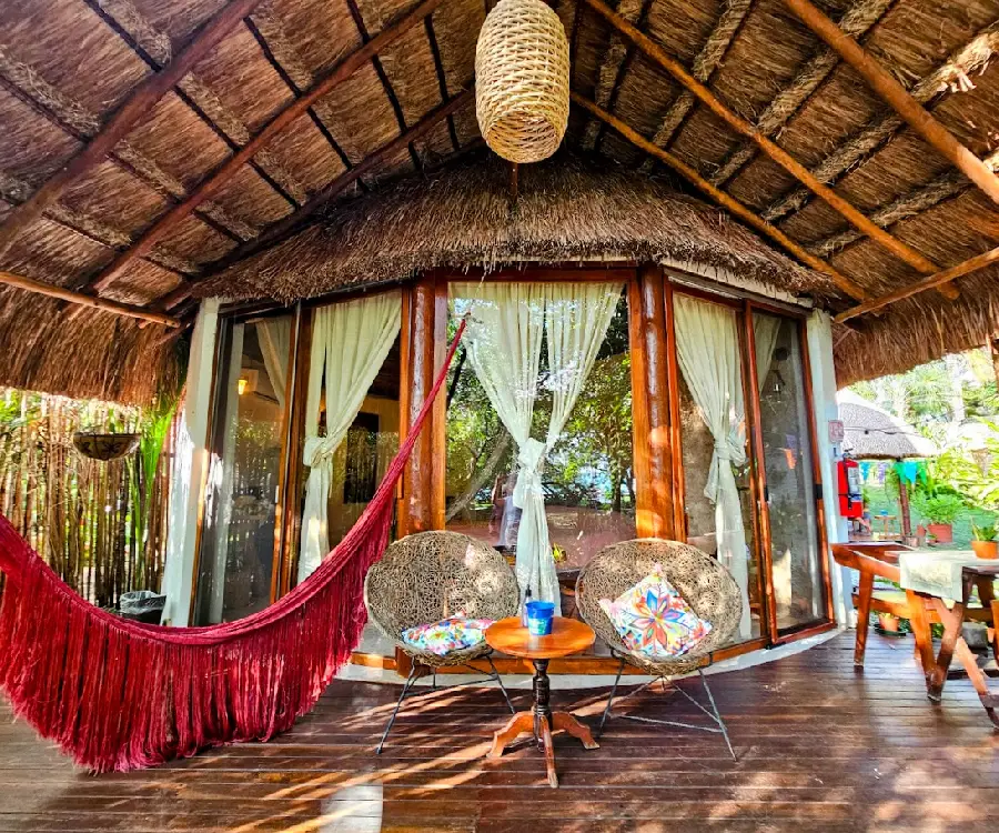 Als we het over echt kleinschalig hebben dan is het wel deze accommodatie. slechts 2 huisjes die in een tuin liggen met uitzicht op het meer van Bacalar. Beide huisjes hebben een eigen terras met hangmat en zitjes.